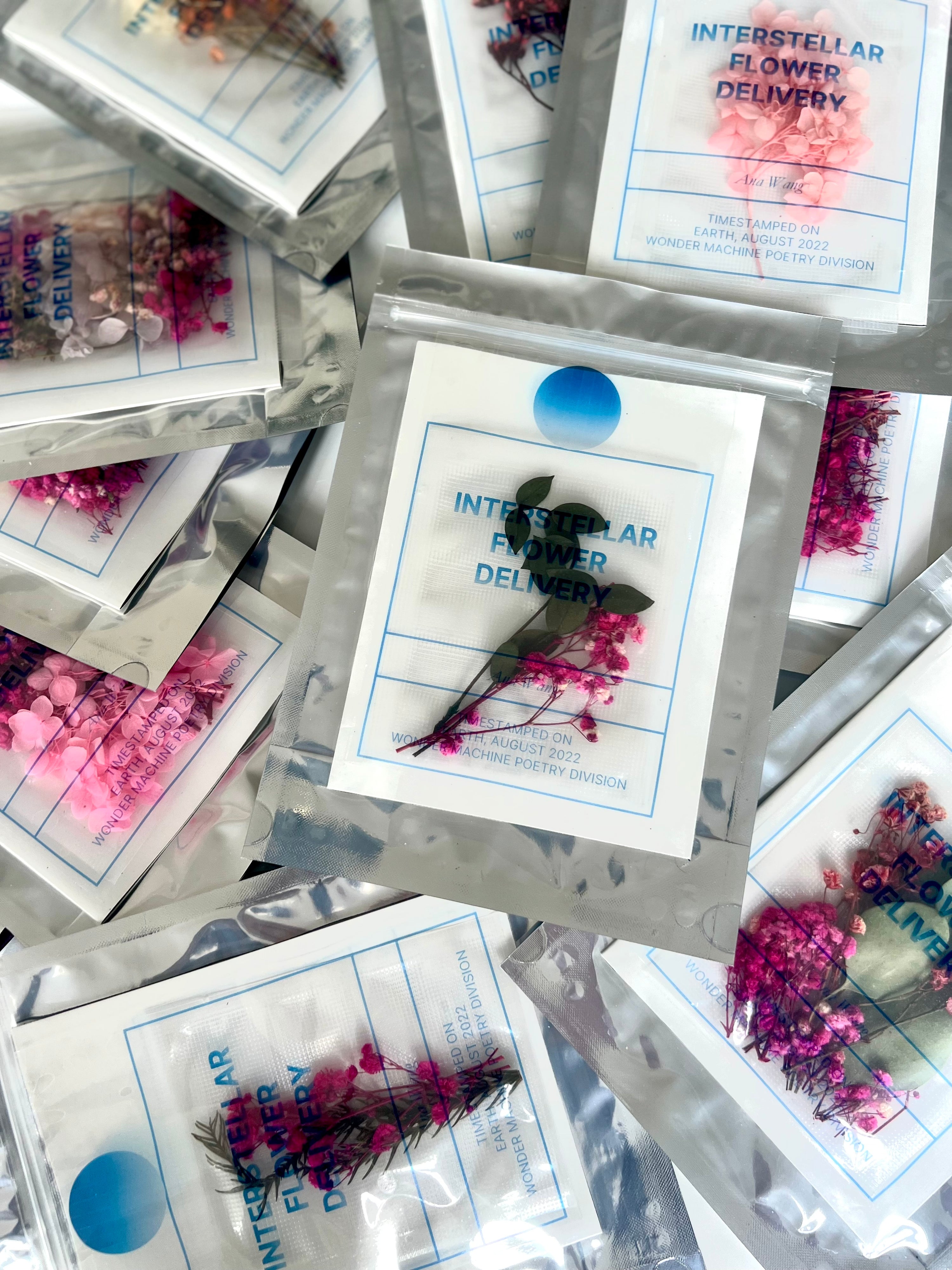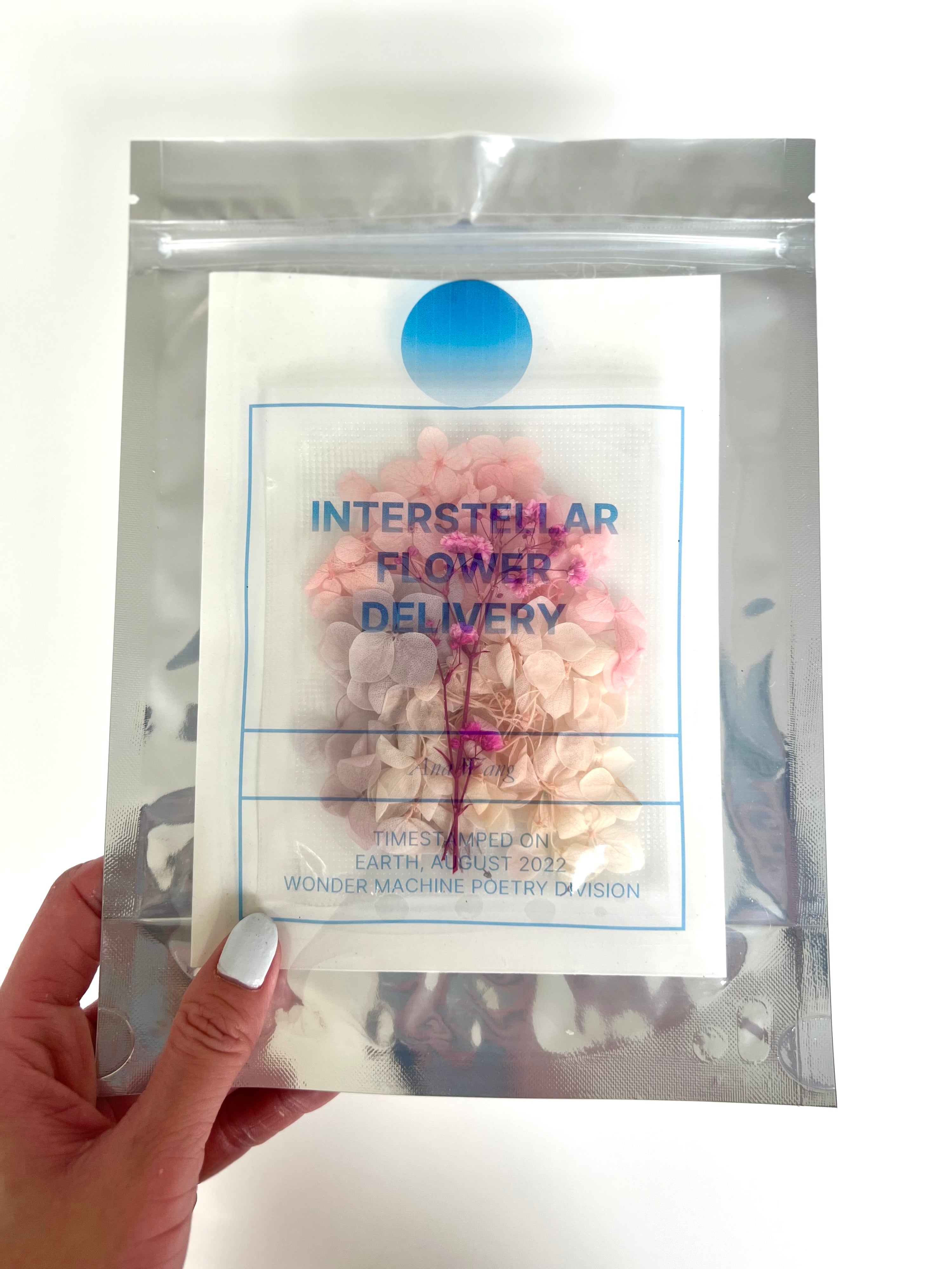 “Who are the flowers for?” Heavily immersed in films taking place in outer space, the view of no gravity seemed to mirror my emotional state. Displaced, free, a vacuum and a void. I mapped 19 original poems about love, grief, creativity, and independence, each to a different image captured and shared via the NASA Astronomy Picture of the Day Archives. Compiled into a chapbook resembling a perfume bottle and delivered with a vacuum-sealed dried flower arrangement—an ode to the ephemeral. Being able to comprehend the cycles of the universe is a gift, and I gave it to myself. And in spite of an instinct to preserve the past, I let it all float away.